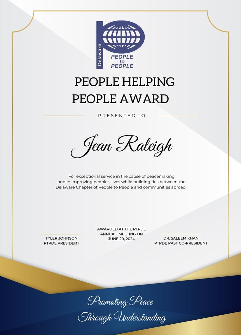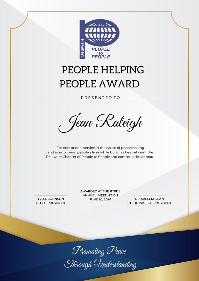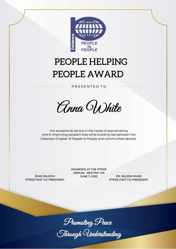 People to People Delaware is pleased to announce Board member, Mary Cella received the Superhero for Peace Award at our annual Peace Week event this year. Mary has been a dedicated and active member of our Board and our Advisory Board for over twelve years. She is a gifted leader and has been tireless with her time and expertise. Mary is a lightning rod in our organization and is usually at the center of planning, problem-solving and crisis management.